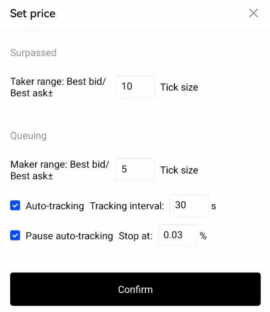 You can further customize your trades using the order types Queuing, Surpassed, BBO and Market. Tap the Set price menu to tweak the “Queuing” and “Surpassed” parameters. These two order types will create a range in which your order will be filled — useful to ensure both legs of the arbitrage are filled at favorable prices.