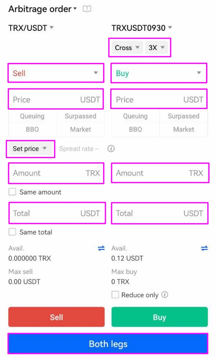 For each leg of the trade, enter the price for your limit order and the amount in the crypto asset or USDT. Alternatively, you can enter your desired spread size using the “Spread rate” option between the two legs.