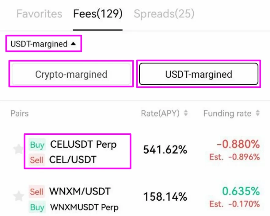 To profit from perpetual swap funding rate payments, tap Fees. To arbitrage the spread between two instruments, tap Spreads