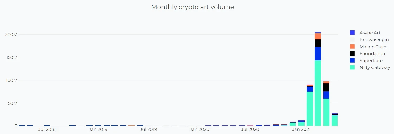 以此前发展态势最为迅猛,先后邀请包括Beeple、Pak、Mad Dog Jones等知名艺术家加盟的Nifty Gateway为例,其4月的销售额为5972万美元,不到3月1.44亿美元的一半。