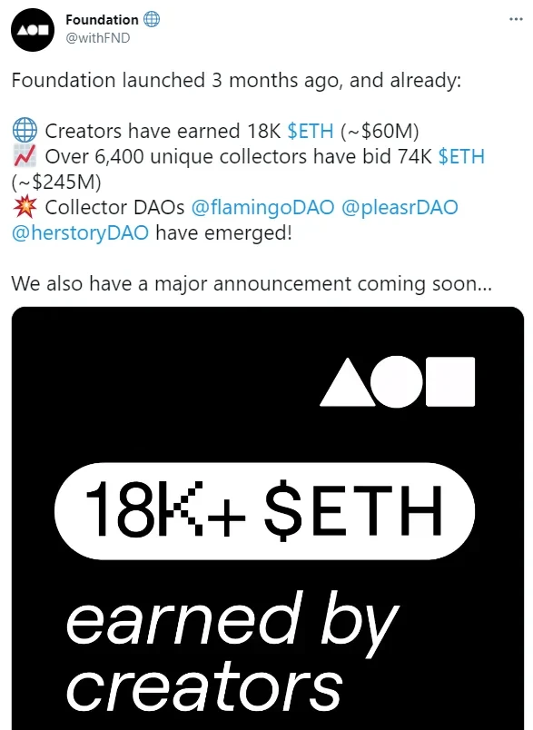 加密艺术平台Foundation发布NFT创作者数据,称平台上线后,截至5月4日,平台创作者已经获得了1.8万枚ETH收入,约合6000万美元。超过6400位NFT收藏家参与平台竞标,拍卖交易额超过7.4万枚ETH,约合2.45亿美元。目前平台上已经出现了如flamingoDAO、 pleasrDAO、herstoryDAO等多个收藏家自治组织。