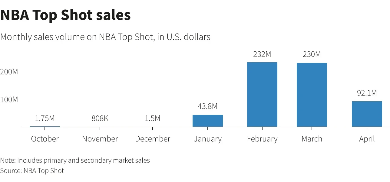 除了艺术板块,因强大品牌背书和粉丝效应的体育类NFT,如NBA Top Shot,在经历了一季度的爆炸式增长后在4月也出现了放缓的趋势。路透社报道称,尽管个别“精彩瞬间”的成交价达到了六位数,但4月份NBA Top Shot的平均成交价并不高,仅为65美元,与此相比,3月份的成交均价为157美元,2月份则达到了182美元。尽管如此,体育类NFT仍以超6万的销售数量占据了4月的榜首,其次是游戏和Metaverse。