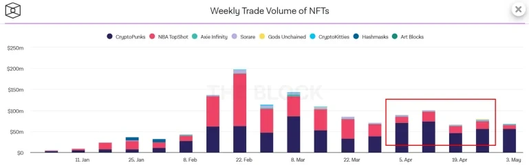 The Block Crypto数据显示,4月份的周交易量普遍低于2月和3月,但仍大幅高于2021年之前的水平。