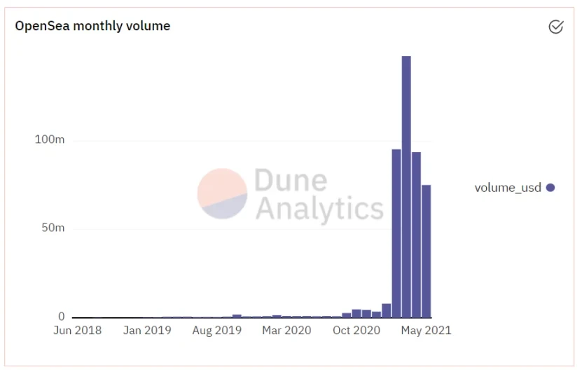 OpenSea作为NFT领域的头部交易平台之一,其交易额在4月出现了下降。据Dune Analytics数据显示,OpenSea 3月的交易额为1.48亿美元,相较于4月的9366万美元,环比缩减了近37%,若与2月的9523万美元相比,4月的数值也下降了2%。可见经历了3月份的热炒后,NFT市场确实出现了降温。