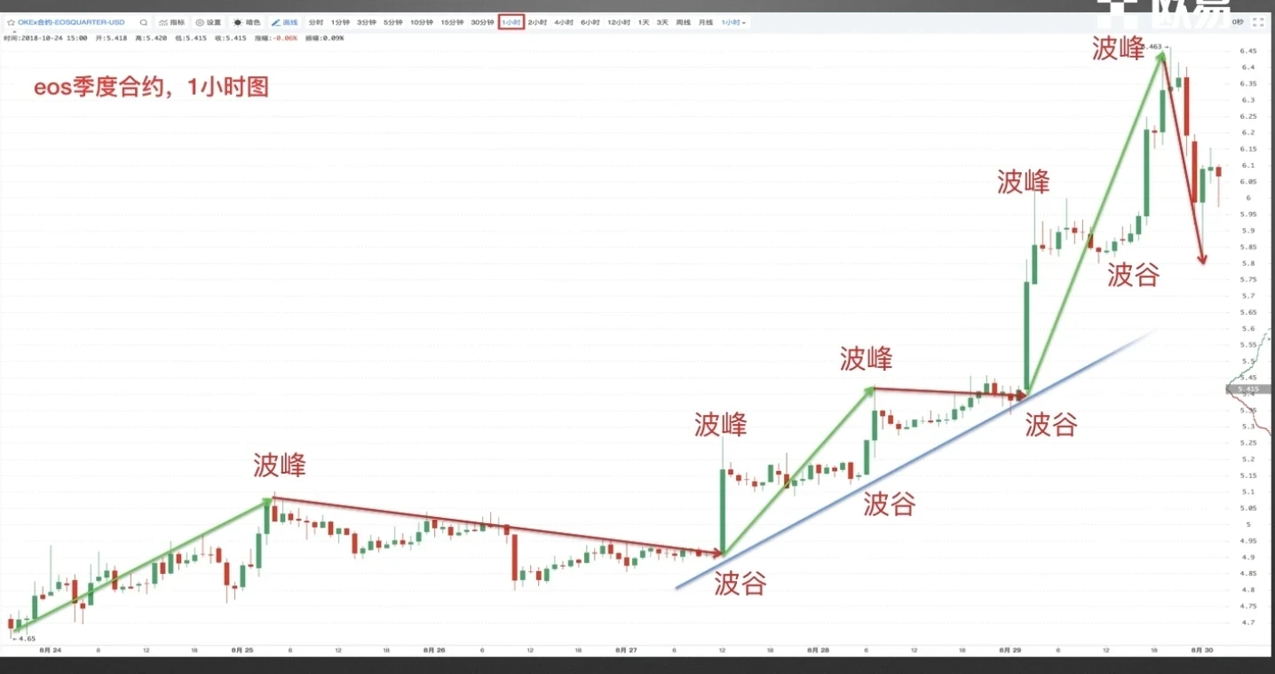 如图所示:欧易合约区EOS季度合约1小时图,波峰、波谷逐渐抬高明显,形成上升趋势。