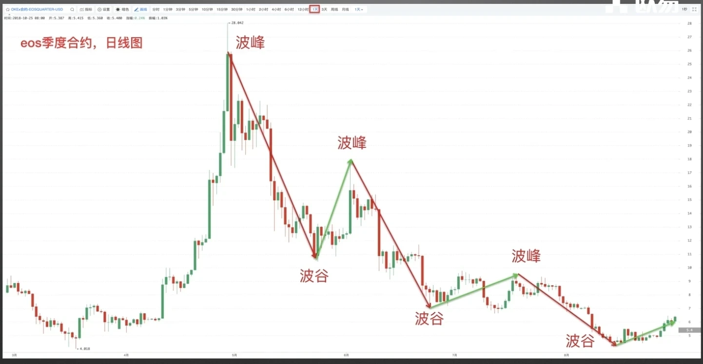而将1小时图切换成日线图,我们会发现,日线图中波峰、波谷却是逐渐降低,形成下跌趋势。