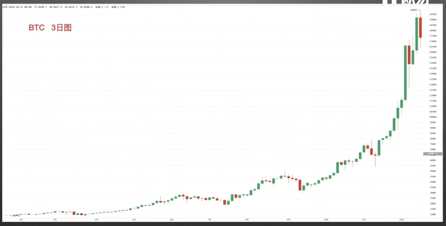图为BTC 3日周期的K线图,每一根K线代表三天。从图中可以看出,比特币这波大牛市从2015年年中就开始了,一直持续到2017年年底,一场持续了差不多两年半的超级大牛市。