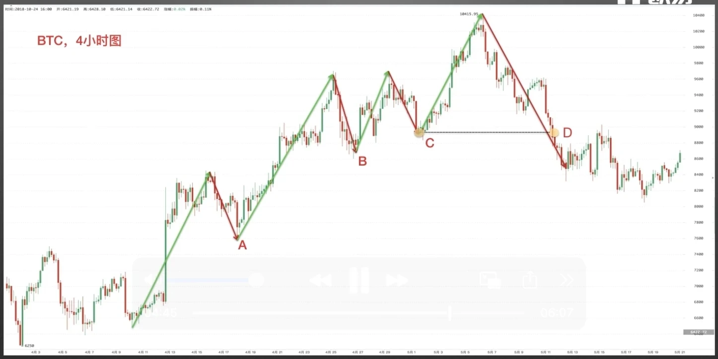 截图来自欧易币币交易区BTC兑USDT的4小时K线图,A、B、C波谷逐渐抬高形成上涨趋势。当价格下跌回调至D点,低于最近上涨起点C时,确认上涨趋势结束。