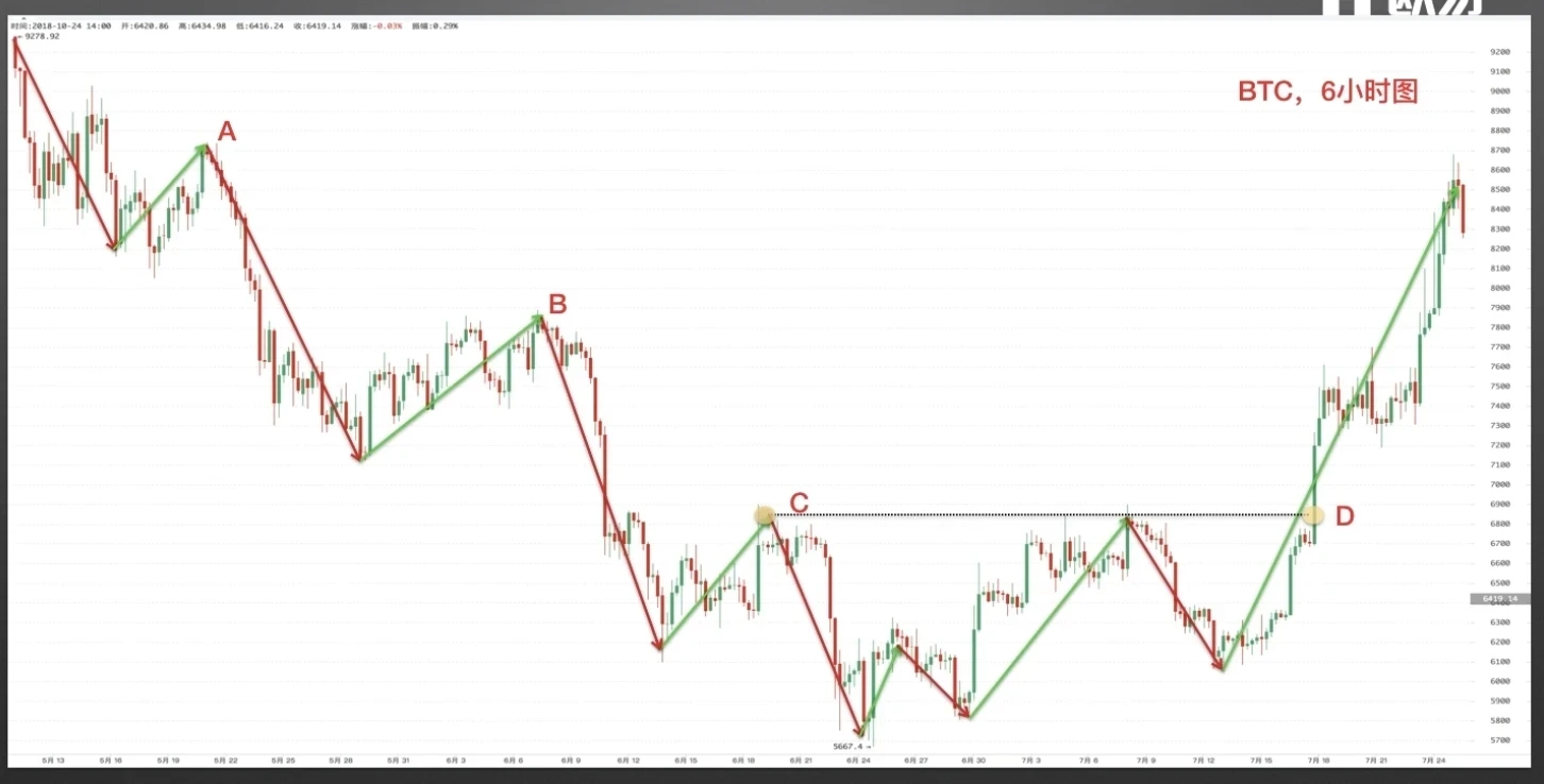 截图来自欧易币币交易区BTC兑USDT的6小时K线图,A、B、C波峰逐渐降低形成下跌趋势。当价格上涨反弹至D点,高于最近下跌起点C时,确认下跌趋势结束。