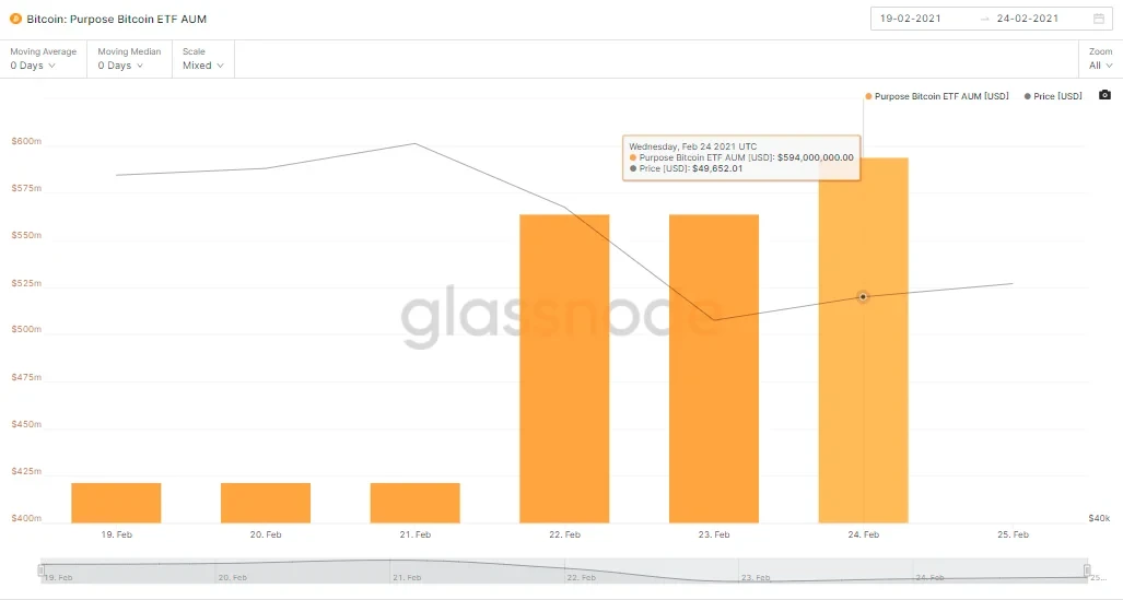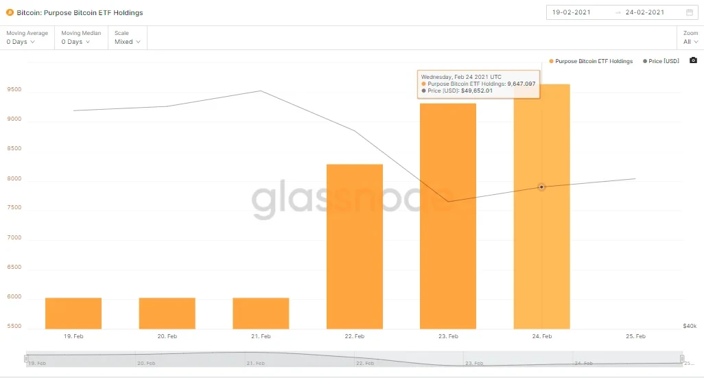虽然加密市场在本周初经历了大幅下跌,但似乎并没有影响全球首支获批比特币ETF产品Purpose Bitcoin ETF(代码BTCC)的资金流入量。据区块链分析公司Glassnode数据显示,在2月22日这一天,该基金就新增了2251枚BTC的资金量,此后两日依旧延续着资金快速流入的趋势。当前,Purpose Bitcoin ETF共持有9647枚BTC。