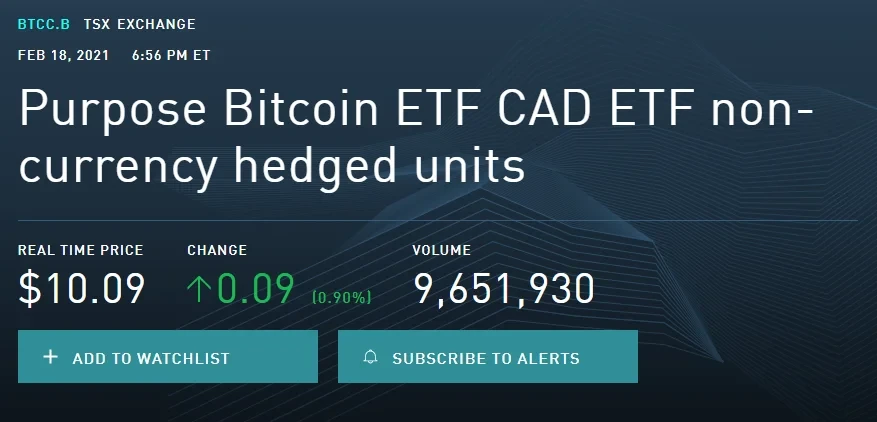 回顾上线时的盛况,Purpose Bitcoin ETF受市场热捧毋庸置疑。TMX.COM数据显示,BTCC在交易的第一小时便产生了8000万美元的交易量,首日总交易额达到了1.65亿美元,总成交量超965万份,这也使它位居多伦多交易所当天所有品种成交量的前10名。