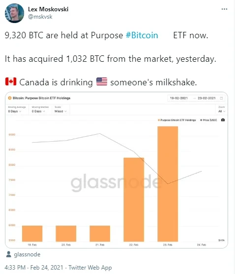 连续两支比特币ETF获批使得加拿大迅速成为全球比特币ETF的温床,知名量化交易员和加密货币投资者Lex Moskovski更是发推称,加拿大正在吸食美国的“奶昔”。