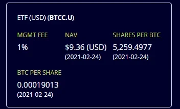 以2月24日Purpose官网BTCC.U的价格9.36美元,每股BTC份额0.00019013计算, BTC的实时价格为50088.67美元,那么BTCC.U的溢价率为-1.72%。