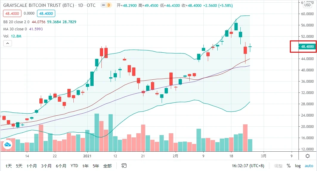 而灰度2月24日GBTC的价格为48.4美元,每股BTC份额0.00094726,那么灰度的GBTC溢价率为2.01%。相当于买BTCC.U不仅比买GBTC要便宜,甚至比直接买同等份额的BTC现货还要划算(当然这里不包括用户分摊到的1%管理费和审计费等,如果计算在内,应该跟购买BTC现货价格接近。)
