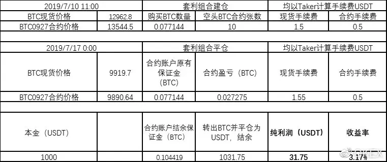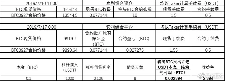 若套利者以0.1BTC为本金,杠杆交易借入1000USDT。2019年7月10日11:00构建期现套利头寸,7月17日00:00平仓为例,计算收益。