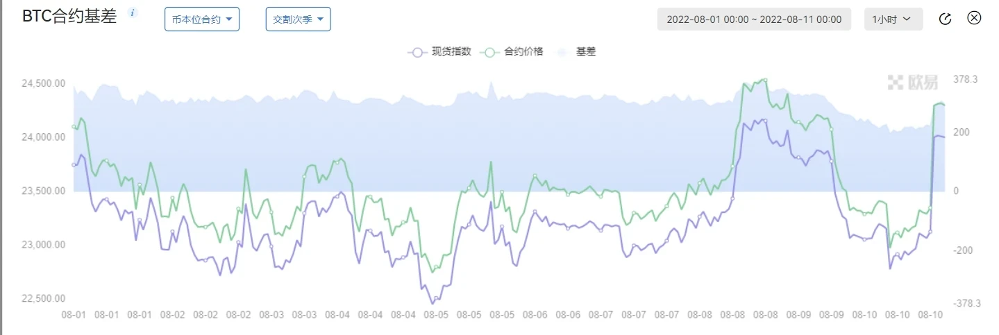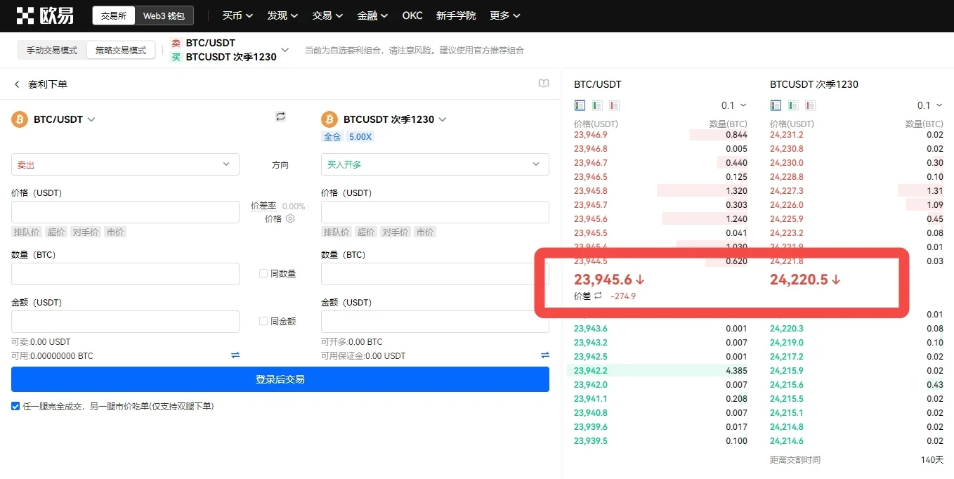 现货价格为标的资产在当前市场的价格,合约价格反映的是市场对于标的资产未来价格的预期,因此同一种标的物的现货价格和合约价格往往存在差异,一般情况下多是合约价格高于现货价格,且无到期日合约或到期日更远的合约价格会更高。如下图所示:在欧易平台上,BTC现货盘口价格为23,945.6 USDT,BTC U本位次季交割合约盘口价格为24,220.5 USDT。
