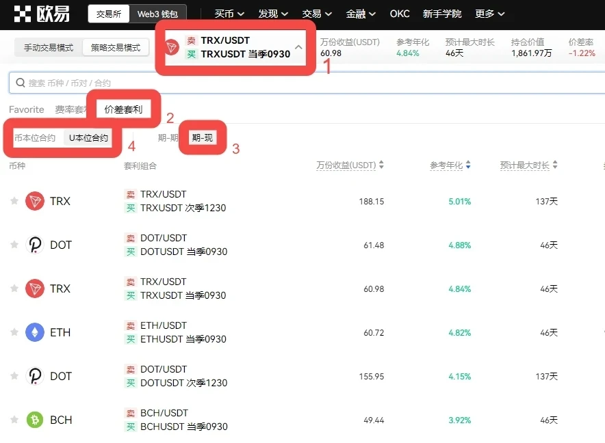 在套利下单页,点击交易对,选择【价差套利】,选择【期-现】模式,随后即可选择币本位合约和U本位合约查询官方推荐套利组合和组合对应交易对、收益情况等信息。