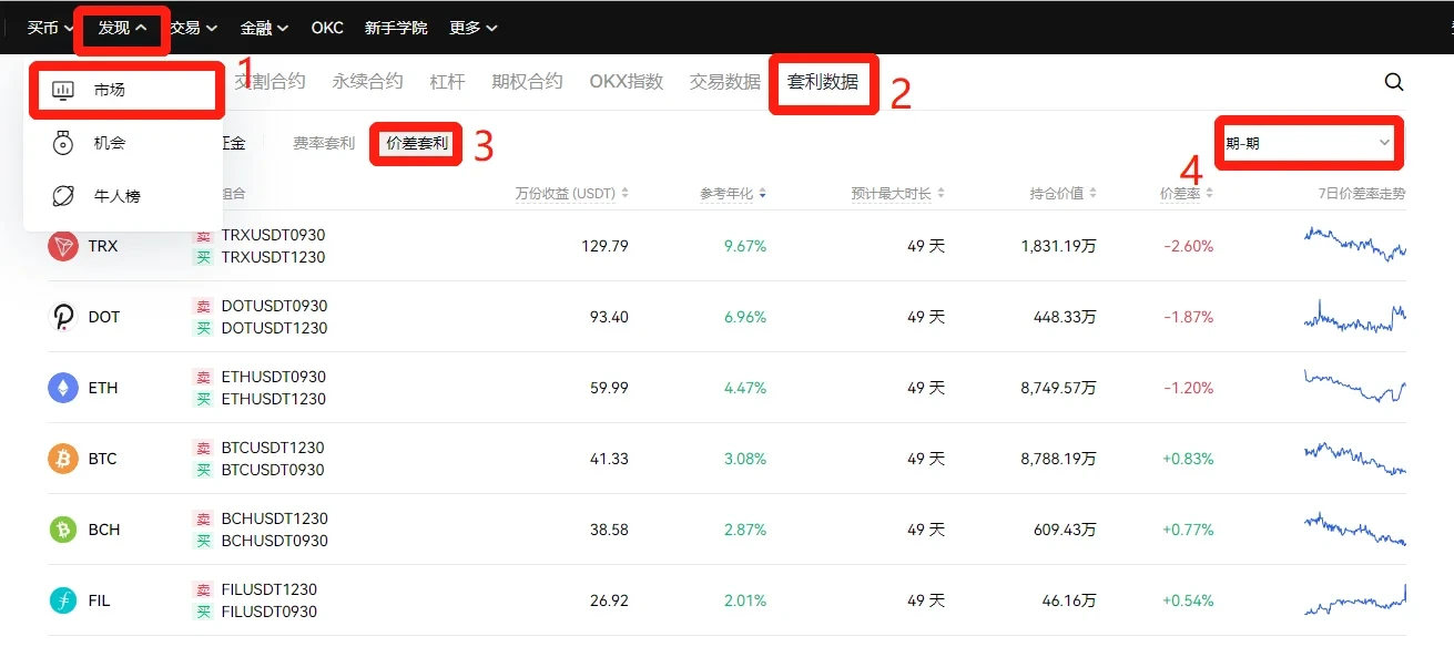 此外,在【发现】-【市场】-【套利数据】页面,也可以查看价差套利相关的详细数据。
